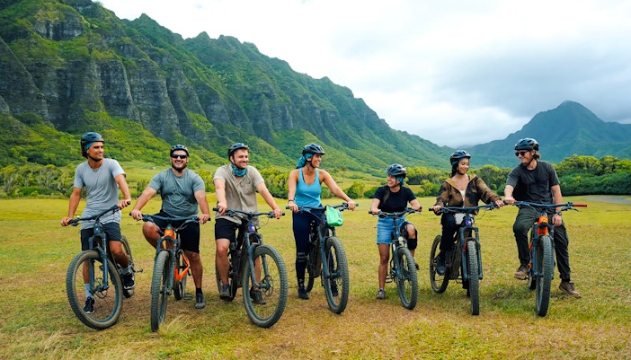 Verken de beroemde valleien van Kualoa Ranch tijdens een e-bike avontuur met gids, waarbij je over verschillende off-road terreinen navigeert.